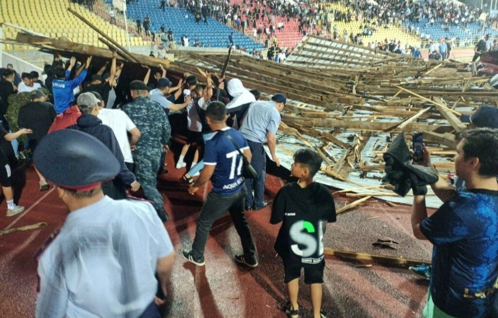 На стадионе в Шымкенте во время матча случилось происшествие, вызванное погодными условиями. С административного здания стадиона ветром сорвало перекрытие. По имеющейся информации, жертв и пострадавших нет.